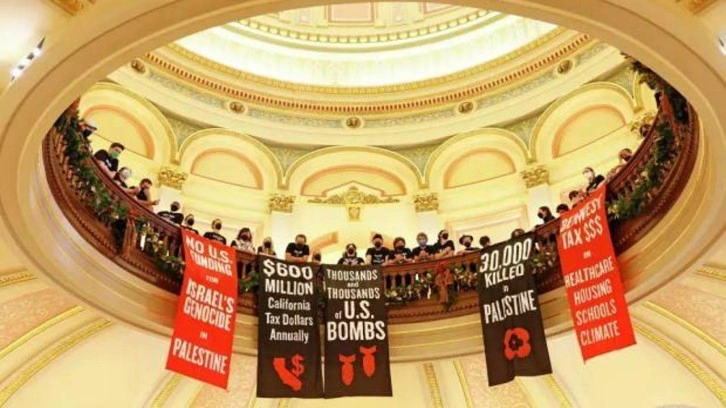 Çarşamba günü Amerika'nın Kaliforniya eyaletinde Filistin Gazze'de yaşatılan soykırım için protesto düzenledi. Protestoyu düzenleyen Anti-Siyonist grup Gazze'yi kana bulayan İsrail'i eleştirdi. Yeni yılı kutlamak için toplanan meclis protesto sonucu kapatıldı.