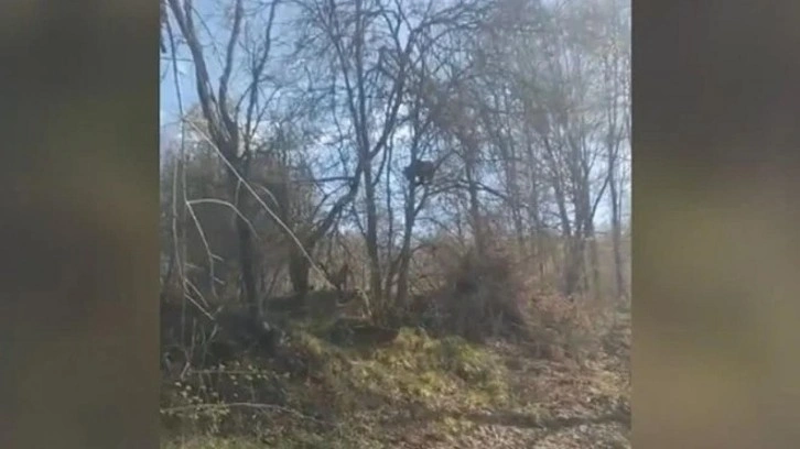 Sesin geldiği bölgeye gittiğinde Kangal köpeklerinden korkan bir ayının ağaca çıktığını gören Açıkel, bu anı cep telefonu kamerasıyla kayda aldı.