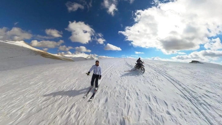 Kar kalınlığının yer yer 40 santimetreye ulaştığı Ergan Dağı'na çıkan Canser Atila ve Recep Sulu, hem kayak yaptı hem de motosikletleriyle tur attı. Erzincan'da geçen günlerde etkili olan yağmur, yüksek kesimlerde yerini kara bıraktı. Yoğun yağışın ardından Ergan Dağı Kayak Merkezi'nde kar kalınlığı yer yer 40 santimetreye kadar ulaştı. Dağın kayak yapmaya elverişli hale gelmesi üzerine, kayak antrenörü Canser Atila ve arkadaşı Recep Sulu, motosikletleriyle zirveye ulaştı. Ergan Dağı'nda sezonun ilk kayağını yapan 2 arkadaş, motosikletleriyle de beyaz örtü üzerinde tur attı. Adrenalin dolu anlarını dron ve kameralarla da görüntüleyen Atila ve Sulu, bu sene sezonun ilk kayağını geçen yıla göre daha erken yaptıklarını söyledi.