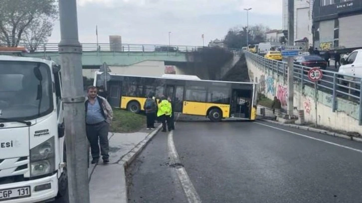 İstanbul Karaköy'de yağış sonrası şoförünün direksiyon hakimiyetini kaybettiği İETT otobüsü kayarak refüjü aştı.