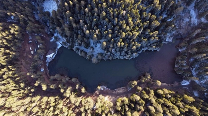 Buz tutan, çevresindeki çam ağaçları karla kaplanan göl, dronla görüntülendi.
