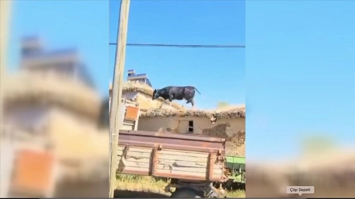 Ardından bitişindeki müstakil evin çatısına atlayan boğa, tekrar ahırın damına indi.