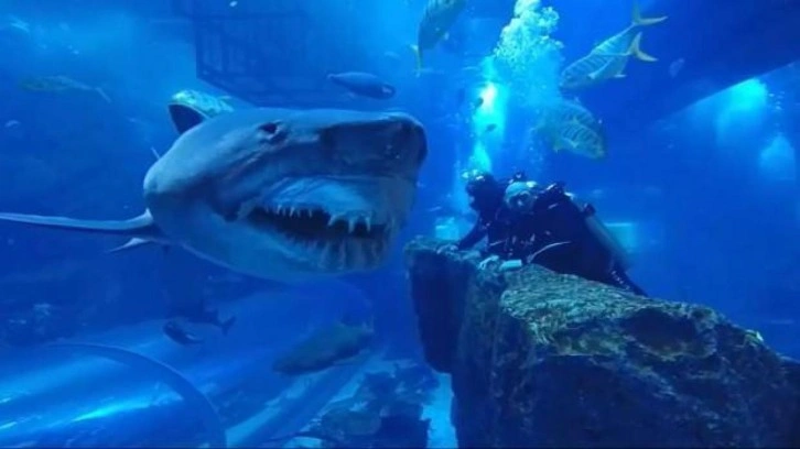 Söz konusu görüntülerin bir balkonun önünde yürüyen ve su altındaki hayvanlara bakan insanlardan anlaşıldığı üzere bir akvaryum içerisinde çekildiği anlaşılıyor.