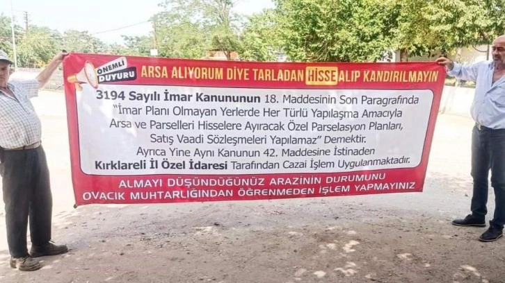 Muhtar Tokatlı'nın konu ile açtığı pankartta, “Arsa alıyorum diye, tarladan hisse alıp kandırılmayın. 3194 sayılı İmar Kanunun 18. maddesinin son paragrafında 'imar planı olmayan yerlerde her türlü yapılaşma amacıyla arsa ve parselleri hisselere ayıracak özel parselasyon planları, satış vaadi sözleşmeleri yapılamaz' denilmektedir. Ayrıca yine aynı kanunun 42. maddesine istinaden Kırklareli İl Özel İdaresi tarafından cezai işlem uygulanmaktadır. Almayı düşündüğünüz arazinin durumunu Ovacık Muhtarlığından öğrenmeden işlem yapmayınız” ifadelerine yer verildi.