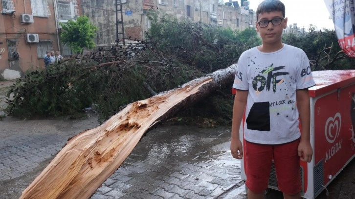 Adana'da dün çıkan fırtınada, devrilen ağaç küçük çocuğun birkaç metre ötesine düştü. Ağacın altında kalmaktan son anda kurtulan çocuk yaşadıklarını anlattı.