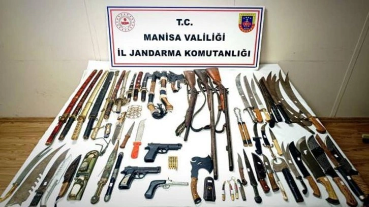 Adreslerdeki aramalarda, 16 ruhsatsız tabanca ve şarjörü, 35 mermi, 15 kılıç, 4 muşta, 8 bıçak, 7 kama, 5 balta, 11 hançer, 5 çakı ile 2 kasatura ele geçirildi.