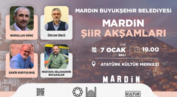 Mardin Büyükşehir Belediyesi Kültür ve Sosyal İşler Daire Başkanlığı, kültür ve sanat etkinlikleri kapsamında alanında tanınmış şairlerin katılımlarıyla Mardin Şiir Akşamları etkinliği düzenleyecek.