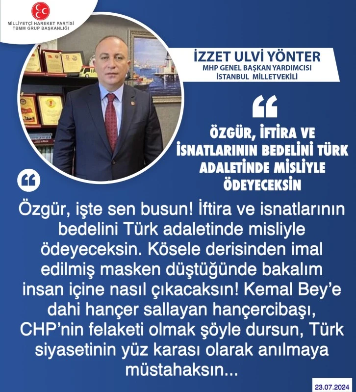 Özgür, işte sen busun! İftira ve isnatlarının bedelini Türk adaletinde misliyle ödeyeceksin. Kösele derisinden imal edilmiş masken düştüğünde bakalım insan içine nasıl çıkacaksın! Kemal Bey'e dahi hançer sallayan hançercibaşı, CHP'nin felaketi olmak şöyle dursun, Türk siyasetinin yüz karası olarak anılmaya müstahaksın...