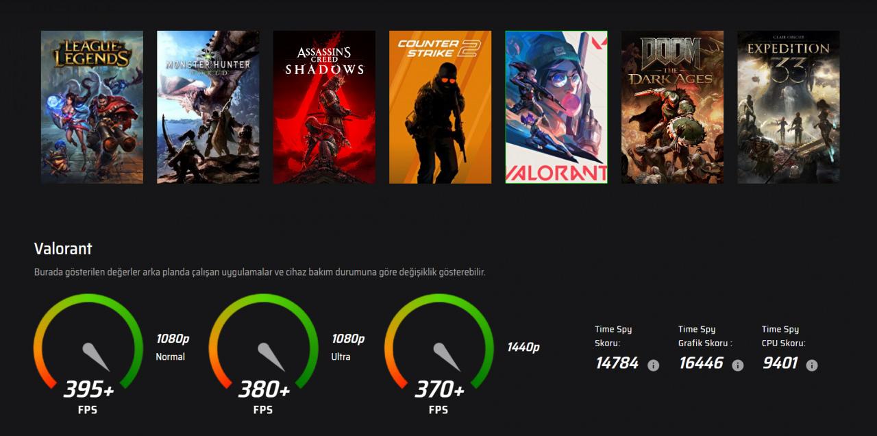 Sistem, popüler oyunlarda oldukça güçlü sonuçlar ortaya koyuyor. Özellikle e-spor oyunlarında yüksek tavan FPS değerleri dikkat çekiyor.