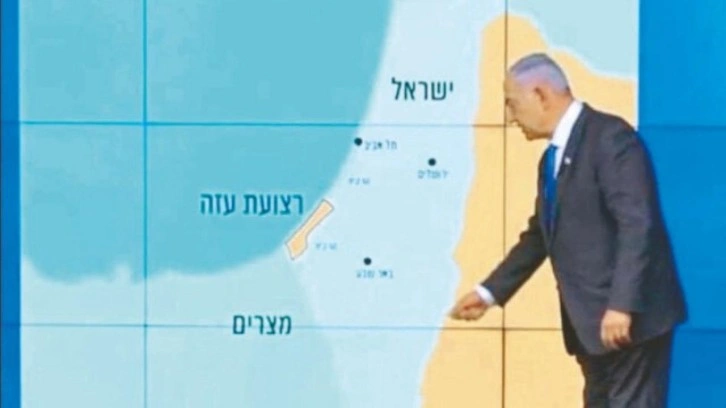 Netanyahu basın toplantısında İsrail ordusunun Gazze Şeridi ile Mısır arasındaki Philadelphia sınır ekseni üzerindeki kontrolünü ancak haritada Batı Şeria'ya herhangi bir atıf yapılmaması dikkat çekti.