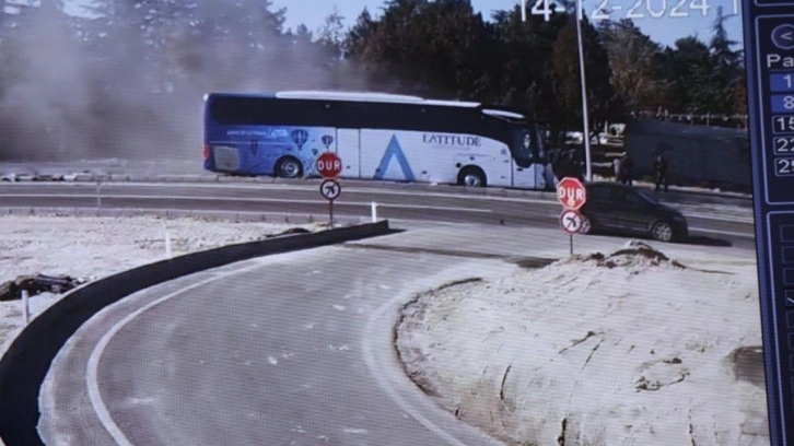 Kaydedilen görüntüde, otobüsün iş makinesine çarpmadan önce 2 işçinin çalıştığı ve otobüsün üzerlerine geldiğini görmesiyle kaçtıkları görülüyor.