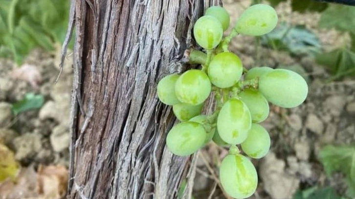 Üzüm bağında salkım düzeltmesi yaptığı sırada bir asmanın omcasında (kütüğü) oluşan üzüm salkımının yumruk büyüklüğünde olduğunu belirten üzüm üreticisi Ahmet Erdoğan, "Bağımda Superiol üzüm türü yetiştiriyoruz.