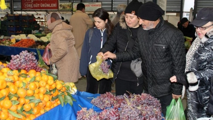 Çanakkale’de 2025 yılına sayılı günler kala kurulan pazarlardaki yılbaşı alışverişleri vesilesiyle doldu taştı. Satışlar sebebiyle yüzü gülen esnaf diğer pazarlara göre bu pazarda yaklaşık 2 kat daha fazla meyve sattığını belirtti. Üzüm, mevsimi olmamasına rağmen son pazar tezgahlarında kendini baş köşede buldu. Meyve alanların bir çoğu, az da olsa üzüm almadan etmiyor.