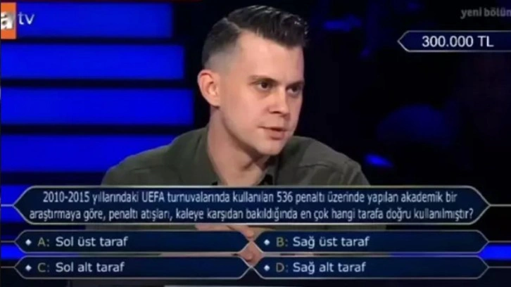 Kim Milyoner Olmak İster yarışmasında sorulan, "2010-2015 yıllarındaki UEFA turnuvalarında kullanılan 536 penaltı üzerinde yapılan akademik bir araştırmaya göre, penaltı atışları, kaleye karşıdan bakıldığında en çok hangi tarafa doğru kullanılmıştır?" sorusunun cevabı merak ediliyor.
