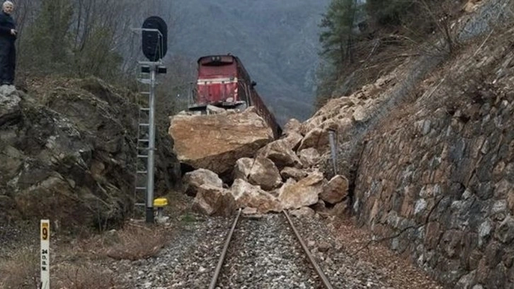 Zonguldak Karabük arasında kömür taşıyan yük treni, heyelanla birlikte demiryoluna düşen kaya parçaları nedeniyle raydan çıktı. İki kent arasındaki demiryolu ulaşımı durduruldu.