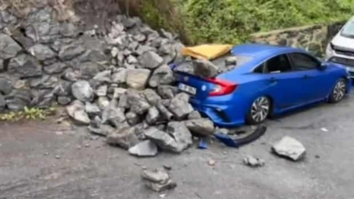 Edinilen bilgiye göre, istinat duvarı şiddetli yağmur nedeniyle park halindeki 34 RP 6842 plakalı otomobilin üstüne yıkıldı.