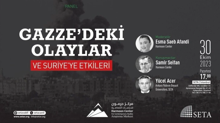 SETA Vakfı, israil'in Filistin'deki katliam saldırılarının Suriye ve Orta Doğu'ya etkilerinin ele alınacağı "Gazze'deki Olaylar ve Suriye'ye Etkileri" adlı bir panel düzenleyecek.