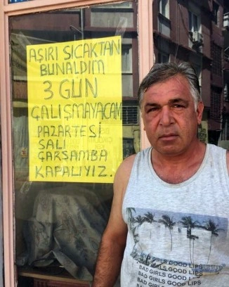 Türkiye'nin en sıcak illeri arasındaki Adana'da fırıncılık yapan 44 yaşındaki Ramazan Şeker, kavurucu sıcaklıktan bunaldığı için fırınını 3 gün kapadı. Şeker, "Aşırı sıcaktan bunaldım. 3 gün çalışmayacağım Pazartesi, Salı ve Çarşamba kapalıyız" yazdığı kağıdı iş yerinin camına astı. Mersin'de deniz tatili yapan Şeker, "Adana 50 derece, fırının içi bunun 2-3 katı. Kendime izin verdim, denize çimmeye geldim" dedi.