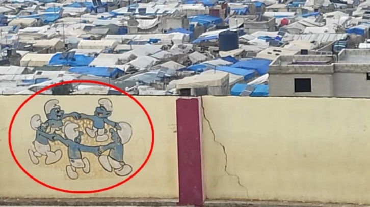 GERÇEKLER "ŞİRİN" GÖRÜNEN DUVARIN ARKASINDASoğuk havaya, yağmura, kara ve çamura rağmen hayatın devam ettiği çadır kentte kaydedilen bir görüntü ise tam anlamıyla bölgede yaşanılanları özetliyor. Her gören çocuğun yüzünde tebessüm uyandıran Şirinler, Kerame'de bir duvara resmedilirken duvarın arkasından görünen tablo ise tüm gerçekleri bir bir yüzümüze vuruyor. Bölgedeki çocukların çizgi film izlemek bir yana üzerlerine giyecek bir parçayı, boğazlarından geçecek bir lokmayı bile zor buluyor olduğu gerçeği yürekleri sızlatıyor.