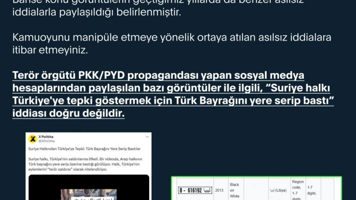 "Terör örgütü PKK/PYD propagandası yapan sosyal medya hesaplarından paylaşılan bazı görüntüler ile ilgili, 'Suriye halkı Türkiye'ye tepki göstermek için Türk Bayrağını yere serip bastı' iddiası doğru değildir. Görüntülerde yer alan araçların Libya plakalı olduğu belirlenmiştir. İddiaya konu saldırının Libya’da, Ulusal Mutabakat Hükümeti ve Türkiye karşıtı milislerce geçmiş yıllarda gerçekleştirildiği tespit edilmiştir. Bahse konu görüntülerin geçtiğimiz yıllarda da benzer asılsız iddialarla paylaşıldığı belirlenmiştir."