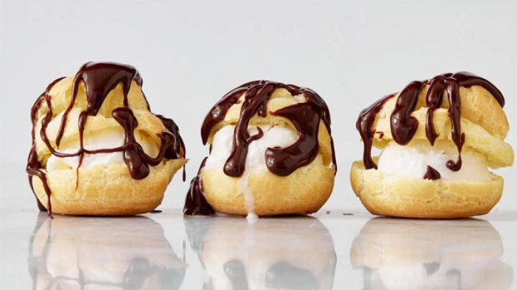 Soğuyan kolay profiterol hamurlarını tırtıklı bir bıçakla ikiye kesin. Her birinin altına küçük bir top dondurma koyun ve üst kısmını kapatın. Ardından üzerlerine hazırladığınız çikolata sosunu gezdirerek servis yapın.