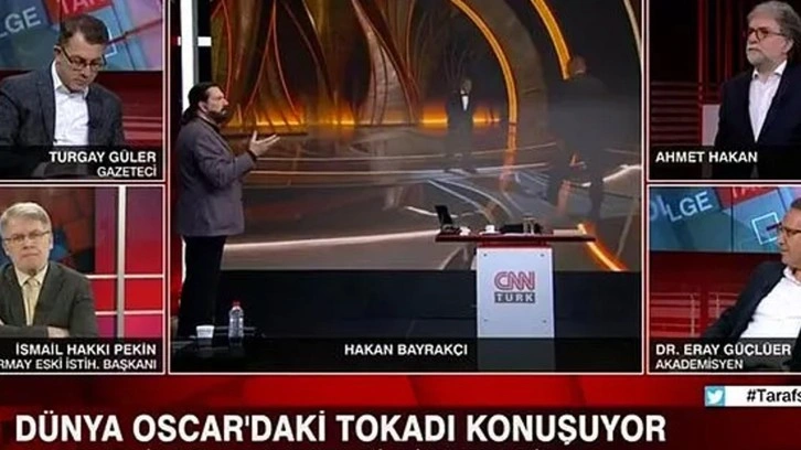 Tarafsız Bölge’de Hakan Bayrakçı, oyuncu Will Smith’in Oscar töreninde sunucu Chris Rock'a attığı tokadı analiz etti. "Will Smith tokadı gerçek mi, mizansen mi?" sorusuna cevap aranan programın diğer konukları ise Emekli Jan.Kur.Albay Eray Güçlüer, G.Kurmay Eski İstih.Bşk. İsmail Hakkı Pekin ve Turgay Güler'di. İlginç anlar sosyal medyada büyük eleştiri aldı.