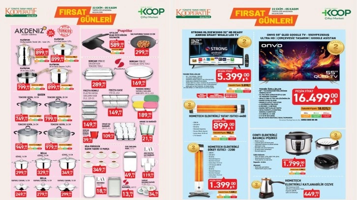 Tarım Kredi Market'te 22 Ekim-5 Kasım tarihlerinde; çaydanlık, basık tencere, derin tencere, tava, güveç tencere, kapaklı sahan, porselen kahve takımı, kavanoz, kavanoz kapağı, çay bardağı, saklama kabı, su bardağı, kulplu bardak, kase, plastik kapak saklama kabı, renkli kapaklı saklama kabı seti, borcam yuvarlak tepsi, borcam dikdörtgen tencere, ocak üstü döküm tostmatik, saç kavurma tavası gibi ürünler indirimli fiyatlarla satışa sunulacak.