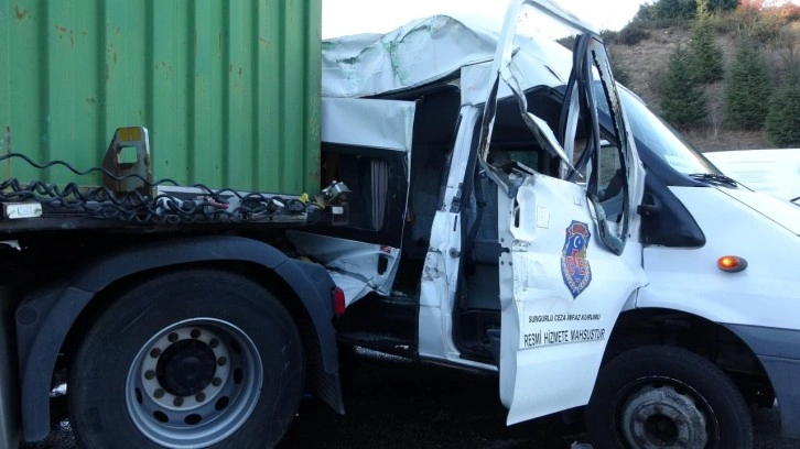 Bu sırada arkasında olan 06 CTV 956 plakalı TIR, emniyet şeridindeki tankere çarptı. Kontrolden çıkan TIR'ın sıkıştırdığı ceza infaz kurumuna ait minibüs de refüjdeki demir bariyerler çarptı.