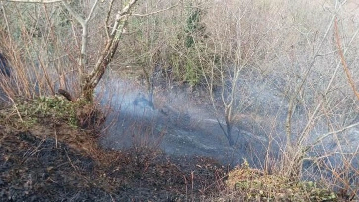 Yangın nedeniyle 2,5 dönüm arazi küle dönerken, ekiplerin soğutma çalışmaları sürüyor.