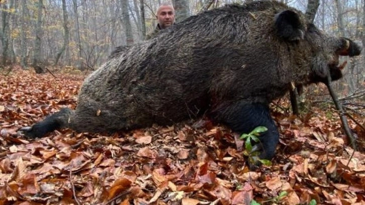 Tarım ve Orman Bakanlığı'ndan alınan iznin ardından araziye çıkan avcılar, Turhal Devlet Avlağı bölgesinde uzun takibin ardından bir domuz avladı.
