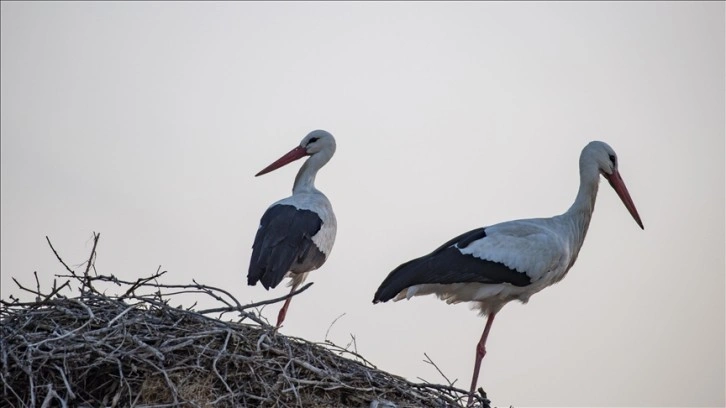 Gündüzleri sulak alanlarda yiyecek arayan leylekler, gün batımında yuvalarına dönerek yırtıcı hayvanların saldırısından korunmaya çalışıyor.