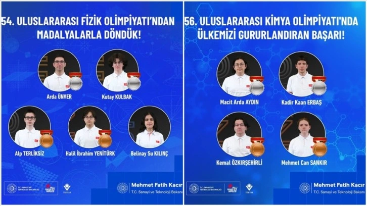 Uluslararası bilim olimpiyatlarından gurur verici haberler almaya devam ettiklerini belirten Kacır, "54'üncü Uluslararası Fizik Olimpiyatı'nda ülkeyi temsil eden öğrencilerden gümüş madalya kazanan Arda Ünver ve Kutay Kulbak'ı, bronz madalya kazanan Alp Terliksiz ve Halil İbrahim Yenitürk'ü, mansiyon derecesi kazanan Belinay Su Kılınç'ı, 56'ncı Uluslararası Kimya Olimpiyatı'nda ülkemizi temsil eden öğrencilerimizden gümüş madalya kazanan Macit Arda Aydın ve Kadir Kaan Erbaş'ı, bronz madalya kazanan Kemal Özkırşehirli ve Mehmet Can Sankır'ı tebrik ediyor, başarılarının bir ömür sürmesini diliyorum." değerlendirmesinde bulundu.