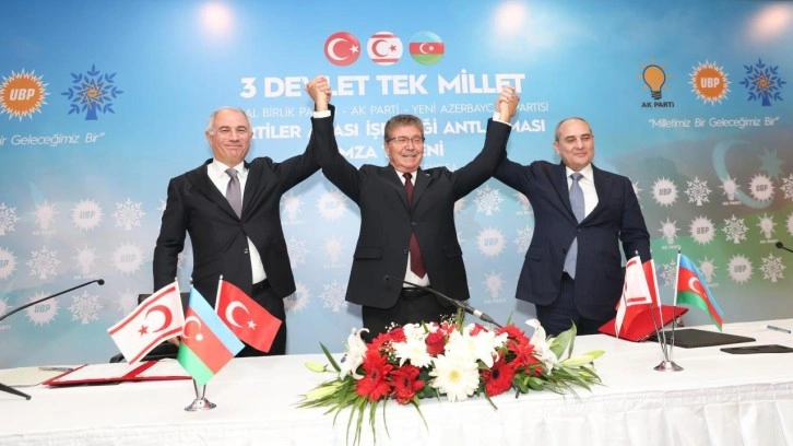 Türkiye'den Adalet ve Kalkınma Partisi (AK Parti), Azerbaycan'dan Yeni Azerbaycan Partisi ve KKTC'den Ulusal Birlik Partisi (UBP) temsilcilerinin katılımıyla "3 devlet tek millet" anlayışı ile ülkeler arası siyasi ilişkileri daha ileriye götürmeyi hedefleyen işbirliği anlaşması için KKTC'nin başkenti Lefkoşa'da imza töreni düzenlendi.
