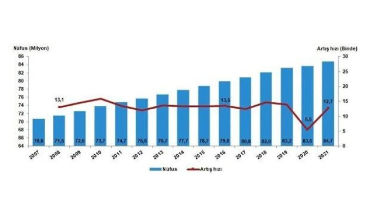 Türkiye'de ikamet eden nüfus, bir önceki yıla göre 1 milyon 65 bin 911 kişi artarak 84 milyon 680 bin 273 kişiye ulaştı. Erkek nüfus 42 milyon 428 bin 101 olurken, kadın nüfus 42 milyon 252 bin 172 oldu. Toplam nüfusun yüzde 50,1'ini erkekler, yüzde 49,9'unu ise kadınlar oluşturdu. Adrese Dayalı Nüfus Kayıt Sistemi (ADNKS) sonuçlarına göre, Türkiye’de ikamet eden yabancı nüfus bir önceki yıla göre 458 bin 626 kişi artarak 1 milyon 792 bin 36 oldu. Bu nüfusun yüzde 49,7'sini erkekler, yüzde 50,3'ünü kadınlar oluşturdu.