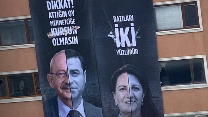 Diğer afişte ise İyi Parti Genel Başkanı Meral Akşener ile HDP Eş Genel Başkanı Pervin Buldan'ın birleşik yüz fotoğrafı kullanıldı. Pankartta, "Bazıları iki yüzlüdür" yazıldı.
