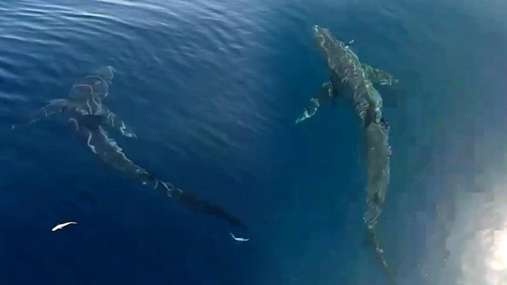 Bir süre su yüzeyinde kalan köpekbalığı daha sonra gözden kayboldu. Balıkçılar o anları cep telefonuyla kaydetti.