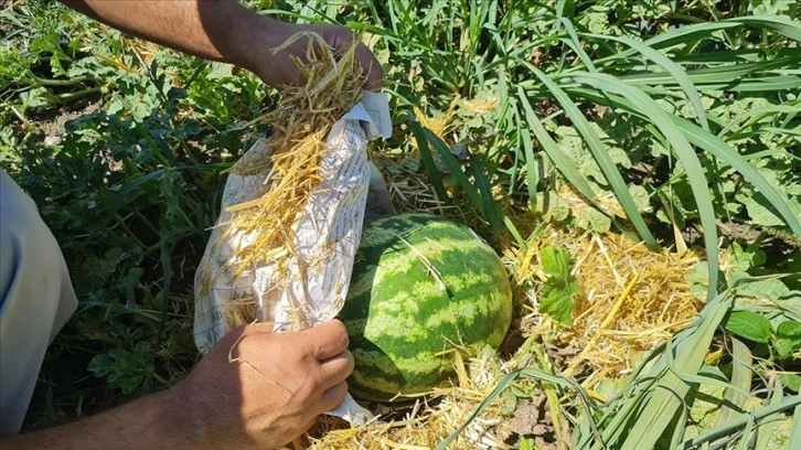 Meyvede güneş yanığı olmaması için çabalayan çiftçiler, karpuzların üzerine gazete ve saman örterek aşırı sıcaktan korumaya çalışıyor.