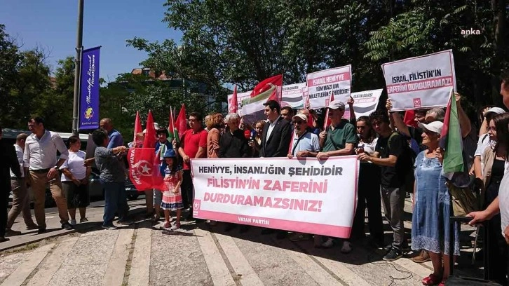 Vatan Partisi Ankara Teşkilatı üyeleri, Ankara'da İsrail Büyükelçiliği konutu önünde bir araya geldi. Sloganlar atan grup adına basın açıklamasını Vatan Partisi Genel Sekreteri Özgür Bursalı yaptı.