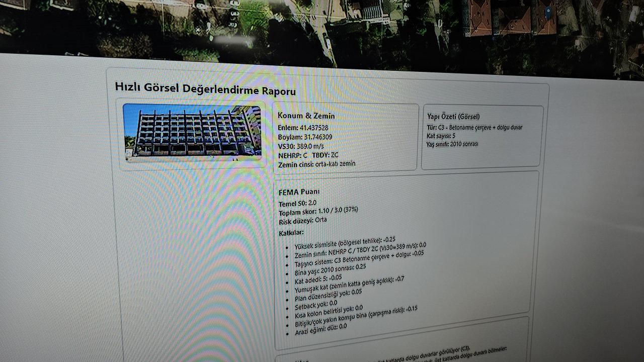 Bülent Ecevit Üniversitesi Mühendislik Fakültesi Geomatik Mühendisliği Bölümü Öğretim Üyesi Prof. Dr. Şenol Hakan Kutoğlu, yazılım ekibiyle birlikte üniversite bünyesinde, binaların deprem dayanıklılığını Amerikan AFAD'ı olarak bilinen Federal Acil Durum Yönetim Kurumu’nun (FEMA) geliştirdiği ‘hızlı bina değerlendirme’ formatında çalışarak ölçen yapay zeka destekli yazılım geliştirdi. Yazılım, binanın görselleri ve sistemdeki harita üzerinden bulunduğu yer seçilerek çalıştırılıyor ve yaklaşık 5 dakika süren analizin ardından, yapay zeka değerlendirme raporunu kullanıcıya sunuyor. ‘Hızlı bina değerlendirme’ formatının deprem dayanıklılığını belirlemek için birinci basamak olarak kullanıldığını ifade eden Prof. Dr. Kutoğlu, insanların binalarına detaylı testler yaptırmadan önce ön bilgi edinmek için bu yazılımı kullanabileceklerini belirterek geniş web sunucusu planlamalarından sonra kullanıma açacaklarını söyledi.
