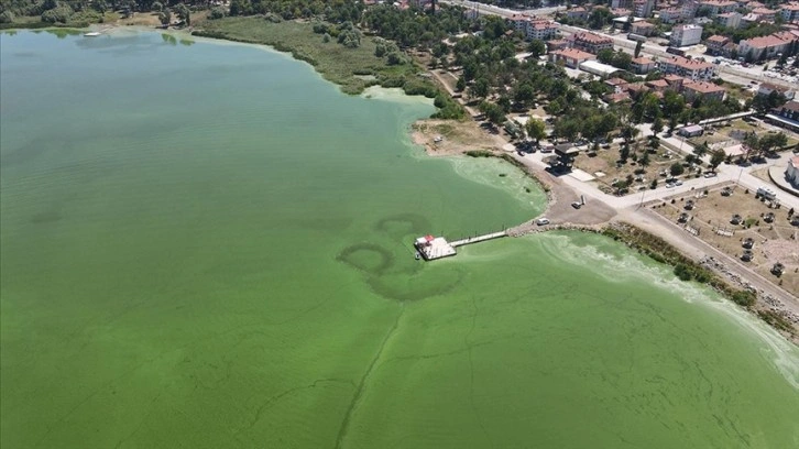 Alg patlaması ile yeşile dönen göl yüzeyi havadan dronla görüntülendi.