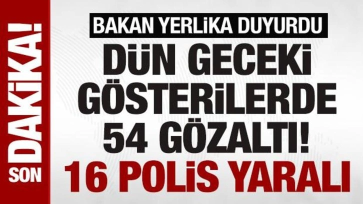 Bakan Yerlikaya, "Bu gösterilerde 16 polisimiz yaralanmıştır. Polislerimize acil şifalar diliyorum. Kahraman polislerimiz, milletimizin huzuru ve güvenliği için gece gündüz demeden görev başındadır." ifadelerini kullandı.