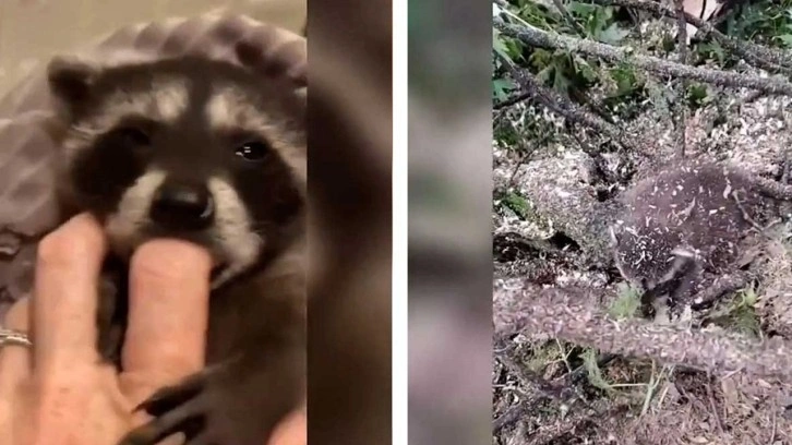 Kurtardıkları yavru rakunu sahiplenen çift, hayvanı temizledikten sonra sevmeye başladı.